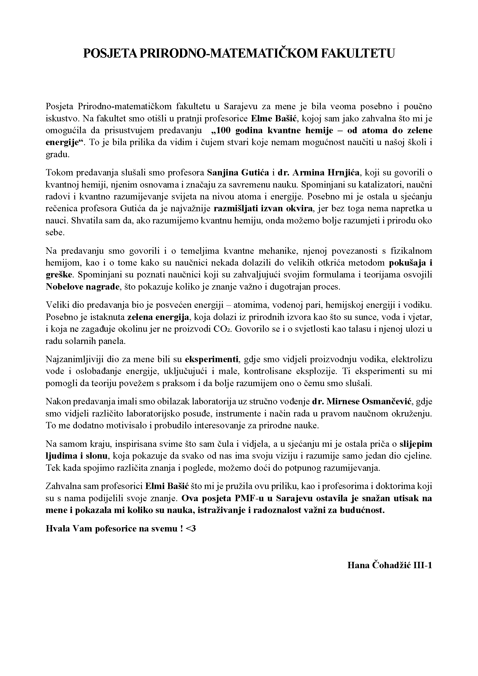 Na poziv Odsjeka za hemiju Prirodno-matematičkog fakulteta Univerziteta u Sarajevu u pratnji profesorice hemije Bašić Elme naši učenici su prisustvovali naučno-popularnom predavanju: